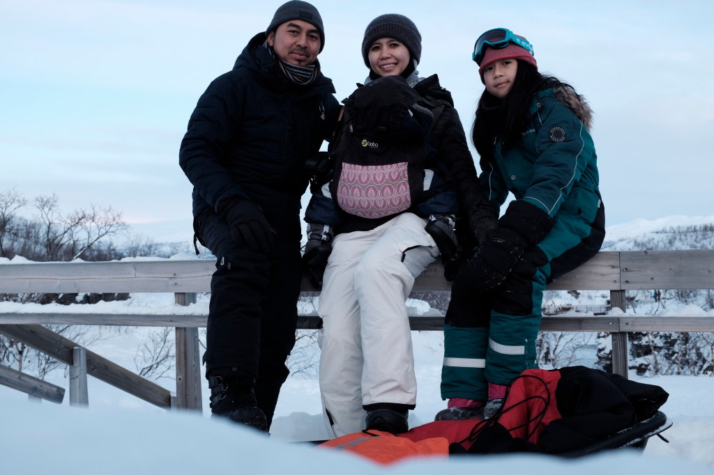 Unfortunately, as the day was getting darker, and we had been outside for hours, my baby started to feel cold and cried, so I got to carry her again on half of our way back to the guesthouse 😀 . So, if you’re thinking of taking your young ones into a winter adventure in Abisko, I would recommend these things: