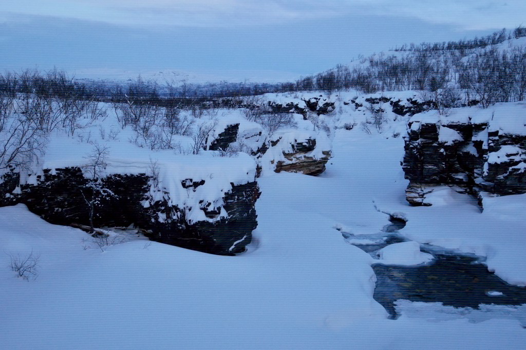 To do this short walk, you need to follow the yellow marked trail. Start from the “entrance” with a sign of Abisko Kunglesden, and in a few minutes you will pass by a small cottage and a museum, continue to the west, pass by a tunnel then you will reach AbiskojÃ¥kka and the canyon which are indeed beautiful. During winter, the canyon is covered by snow and the river is half frozen so it’s quite a view.