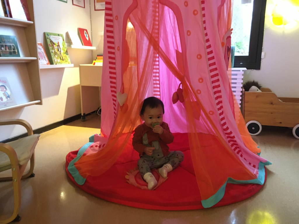 Tahun lalu, saat K berumur kurang dari satu tahun, saya dan suami memutuskan untuk mengikutsertakan K ke kegiatan open preschool. Alasan utamanya untuk mengurangi stranger anxiety K yang salah satu penyebabnya adalah jarang bertemu orang lain selain keluarga inti. Menurut referensi yang kami baca dan pengalaman kami dengan anak pertama, hampir semua anak mengalami stranger anxiety, tapi kadar dan durasinya macam-macam. Kebetulan K memang sangat lengket dengan saya sejak lahir. Dia tidak selalu mau disapa atau dipegang orang baru. Dia butuh waktu untuk beradaptasi dan merasa nyaman di lingkungan baru. Karena itu, kami merasa perlu mengenalkan dia dengan ruang-ruang lain selain keluarga, melalui sekolah salah satunya.